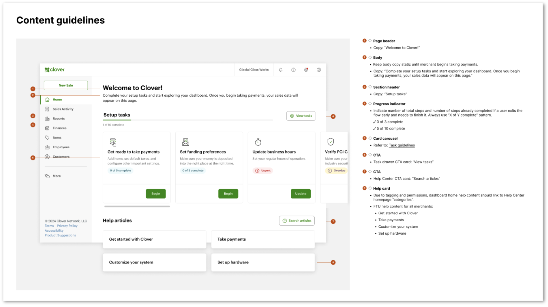 Developed a “home screen takeover” design and content strategy that welcomed users, highlighted critical setup tasks, and explained how the homepage would change as they began taking payments.